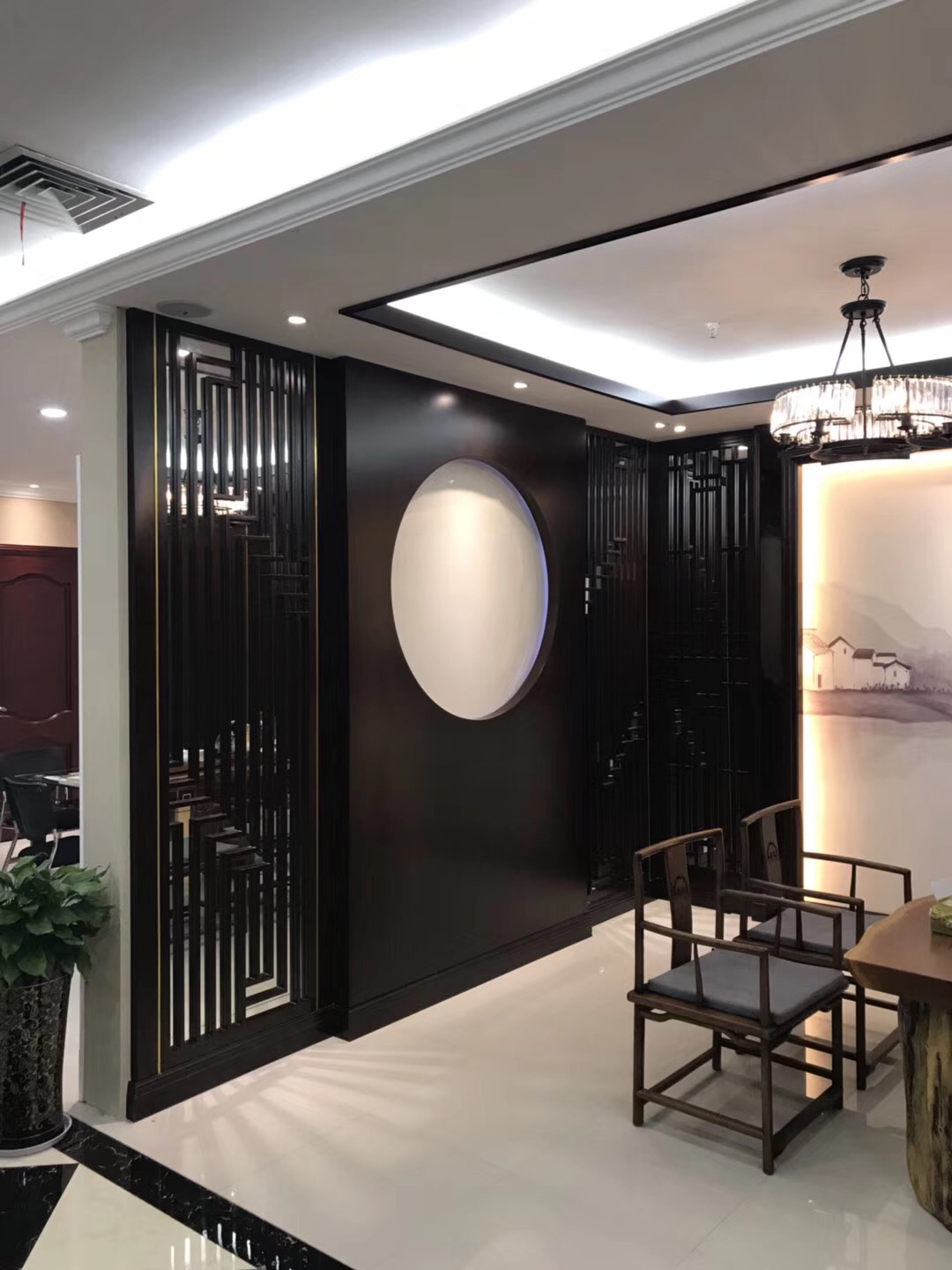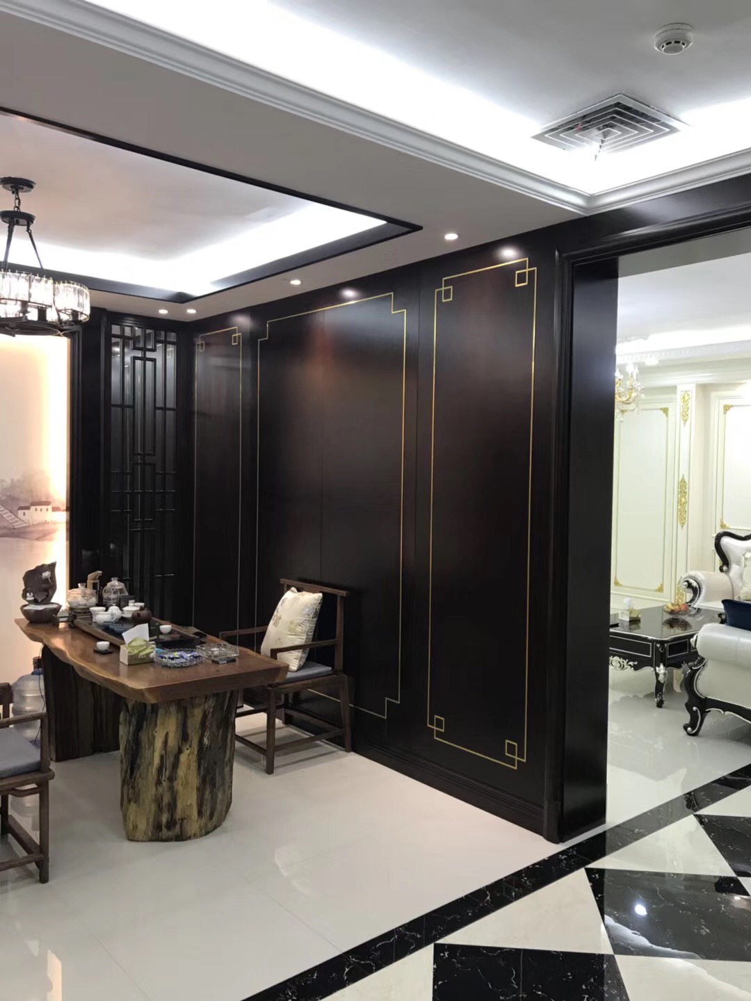 深灰色的木皮整体的感觉更加的低调和优雅,有着中式的内敛含蓄之感。亮光漆的运用,一方面可以提升空间亮度,削弱灰色带来的沉闷压抑,另一方面也增加了整个设计的时尚度。